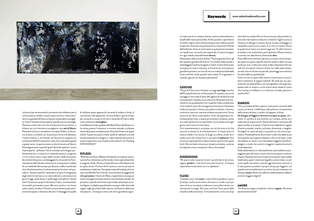 La maggior parte delle mie opere sono realizzate con materiali trasparenti, traslucidi e cangianti che hanno generalmente bisogno di luce e di allestimenti in ambienti chiari per essere valorizzate al meglio. Il MACRO Asilo - Museo d’Arte Contemporanea di Roma, mi ha proposto di realizzare un progetto interattivo, che coinvolgesse il fruitore, in una stanza completamente nera e in penombra: la Black Room. Inizialmente ho pensato che i presupposti fossero tutti sbagliati, che tutto fosse contrario al mio lavoro, che non avesse senso esporlo lì. Ma poi ho cominciato a ragionare diversamente, a rompere gli schemi in cui avevo spesso, involontariamente, e automaticamente, adagiato e racchiuso la visione del mio lavoro per tenti anni, e mi sono aperta a nuove prospettive e possibilità, modificando e capovolgendo totalmente il mio punto di vista, e le mie certezze: Non ci sono pareti bianche?Ok, le opere non verranno appese, ma arrotolate su se stesse. Non c’è luce? Il pubblico deve interagire? Ok, metto degli specchi in queste “bocche” e chiedo al fruitore di utilizzare la luce del proprio smartphone per illuminare le opere come meglio crede, come più lo incuriosisce. È il fruitore che si fa protagonista, che va alla scoperta, è lui che sceglie la luce, che sceglie la prospettiva e l’angolazione. Io ho voluto creare solo un’opportunità, ma è toccato al fruitore cercare nuove forme, vedere e fermare ciò che voleva vedere e come voleva vederlo. Di conseguenza il progetto #INTHESPACE è nato da una riflessione sulla complessità e sul disordine della realtà narrati ne “Le città invisibili” di Italo Calvino, e sui grafi, che sono delle strutture relazionali e organizzazione dati che troviamo nella vita quotidiana e nella comunicazione virtuale. Quello che mi interessava era soffermarmi sul modo, spesse volte superficiale e illusorio, di esprimersi e comunicare della società di oggi attraverso principalmente i social network. L’installazione comprendeva una serie di poliesteri emulsionati che ho dipinto in camera oscura attraverso chimici fotografici e che poi ho arrotolato su se stessi creando simbolicamente delle bocche; all’interno poi ho posto degli specchi che, illuminandoli, creavano immagini caleidoscopiche irripetibili. La bocca è per eccellenza lo strumento che utilizziamo per la comunicazione verbale, ma può essere anche un mezzo attraverso cui guardare all'interno e lasciarsi sorprendere andando in profondità. L'etimologia della parola "spazio", viene da Spatium, ovvero "essere aperto”. La levigatezza dei poliesteri che ho utilizzato, richiama simbolicamente gli schermi luminosi degli smartphone attraverso i quali siamo abituati a comunicare nei giorni d’oggi. Ho poi praticato su di essi delle incisioni che si intersecano a simboleggiare le reti sociali e la frammentazione dell’individuo attraverso le scomposizioni indette da una realtà dei fatti sempre più distorta, e dalla raccolta dati che, volontariamente e involontariamente, forniamo nel quotidiano. L’installazione è stata ospitata nella Black Room del museo e, il mio intento è stato quello di portare il visitatore, in maniera naturale, ad utilizzare la luce del proprio smartphone per illuminare l’interno di questi cilindri. Successivamente è stata creata una rete sociale postando le immagini e video realizzati dagli spettatori, sui principali social network con l’hashtag #INTHESPACE.